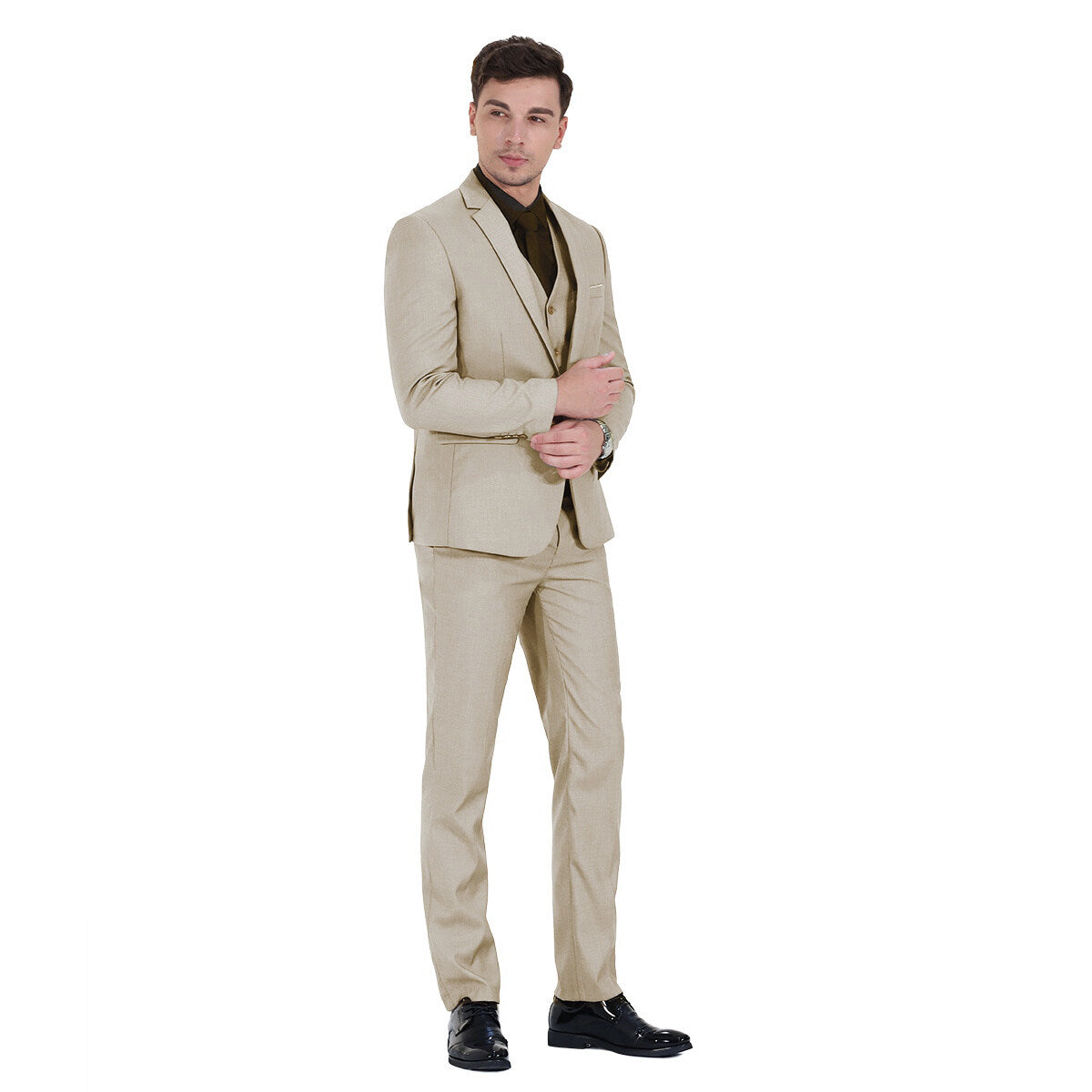 Upgrade your wardrobe with our slim fit suit, featuring a peaked lapel design, four buttons on the sleeve, button closure, and 3D draping for a sharp and modern look. The flat front free-length pants with extended waist strap and slanted side pockets complete the ensemble for any occasion, from weddings to business meetings and parties.