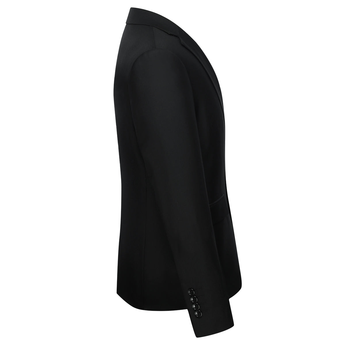 Unser zweiteiliger, schmal geschnittener schwarzer Anzug besteht aus einer hochwertigen Mischung aus 70 % Polyester und 30 % Viskose für höchsten Tragekomfort und Langlebigkeit. Das Innenfutter besteht aus 94 % Polyester und 4 % Viskose und ist atmungsaktiv und schweißabsorbierend.